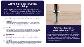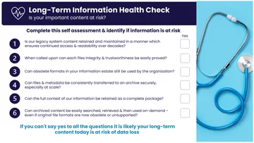 Long-term content needs more than regular backup & archiving. Without the right tools it is at risk from loss & corruption. Read the executive guide & take the health check to see if your high-value information is at risk today