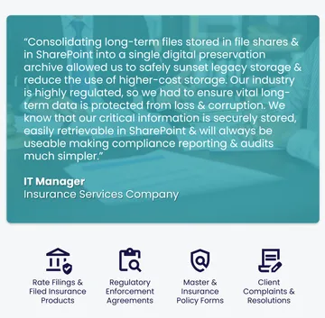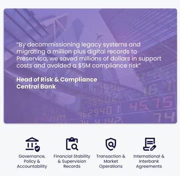 Major banks, insurers and pension providers rely on Preservica’s intelligent archiving and Active Digital Preservation™ platform to optimize storage costs and ensure the long-term accessibility and integrity of high-value data - from strategic decision-making to key operational records.