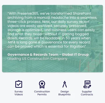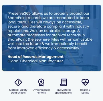 Developed in collaboration with Microsoft, Preserve365® embeds the archiving, Active Digital Preservation™ and retrieval of long-term records right into the Microsoft 365 and SharePoint experience. Use your existing Microsoft software investments to automate archiving processes, optimize SharePoint costs and provide SharePoint users with instant access to always actionable and trusted records for regulatory, legal and operational needs. With Preserve365 your long-term data is optimized and ready for AI.