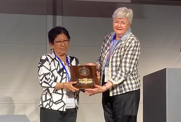 Aída Luz Mendoza Navarro, 2025 Emmett Leahy Award Winner, being presented with this year’s award by Trudy Peterson, Consulting Archivist and winner of the 2018 Award (right)