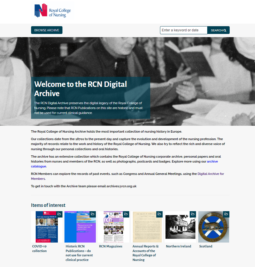The RCN Digital Archive holds the most important collection of nursing history in Europe. The archive has an extensive collection which contains the RCN corporate archive, personal papers and oral histories from nurses and members of the RCN, as well as photographs, postcards and badges.