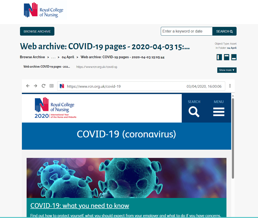 Fiona Bourne, Archive Manager at RCN, shared her main motivation for the team’s proactive collecting efforts. "In February 2020, we started saving emails, press releases, web pages and clinical guidance resources. As an archive team, we did this from instinct knowing that these records would form a significant part of our contemporary collecting."