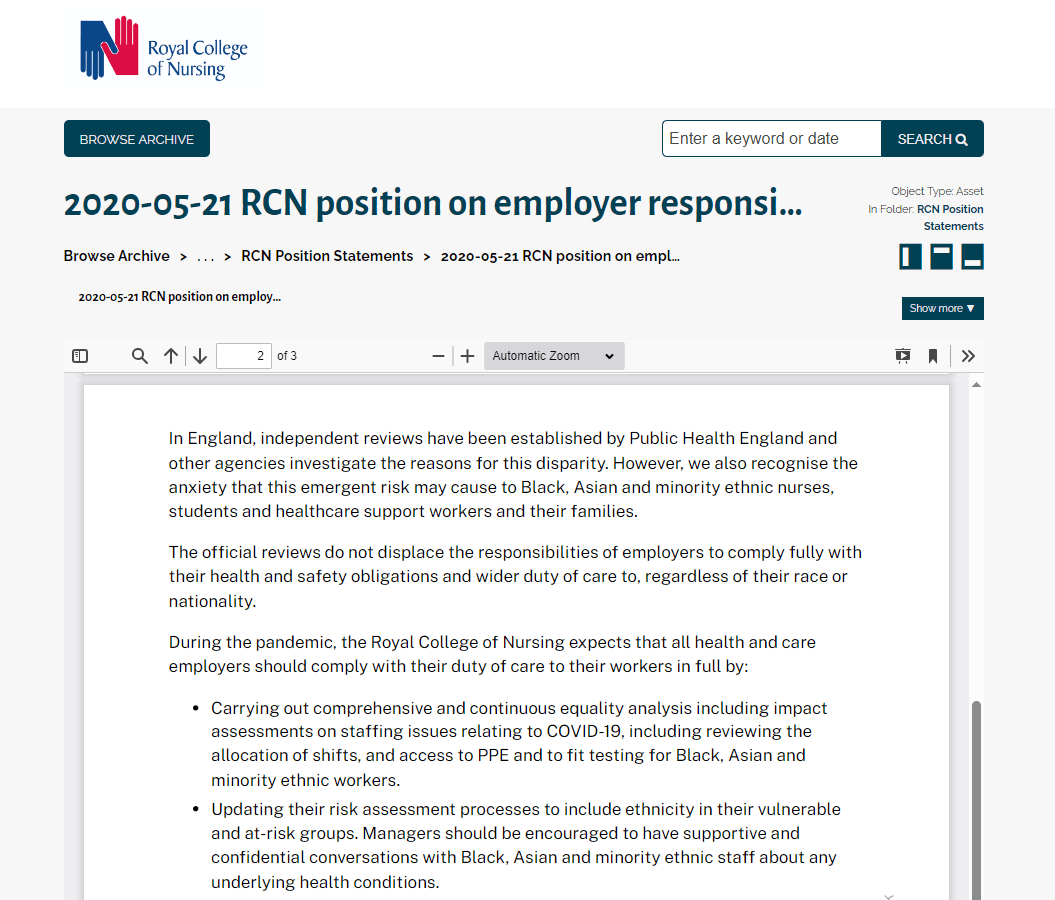 The UK and Scottish governments are currently running public inquiries into how each responded to the pandemic. The RCN has been called to give evidence to both inquiries. With the need to answer specific questions to tight legal deadlines, the RCN produced thousands of evidential records about the organisation’s activities relating to each module topic. The RCN legal team was given secure access to the digital archive where they could retrieve records with a persistent digital location. With the support of the archive team they have been able to respond promptly and effectively.