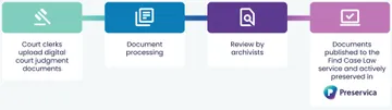 Court clerks upload digital court judgment documents using The National Archives’ bespoke Transfer Digital Records service. These are processed – for example, to create multiple versions for publication - before being reviewed by archivists. Once the review is complete, the documents are published to The National Archives’ Find Case Law service for global access. Simultaneously, these documents enter Preservica’s ecosystem, where they are actively maintained for long-term integrity and usability.